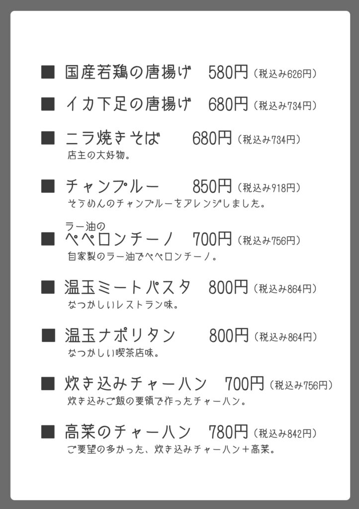 ●お持ち帰りパック代として100円(税込み110円・パック数にかかわらず)をいただきます。